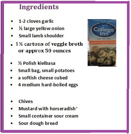Step 3: Chop your onions and garlic and brown with some olive oil or butter. Add to potatoes. Next, brown your lamb or beef so its got a head start on cooking and had a chance to work in the onion and garlic. It doesn’t have to cook thoroughly, just give it a head start. Add to soup pot. Turn up the heat so it has a gentle bubble. If you are just using ham and kielbasa, skip the browning part.