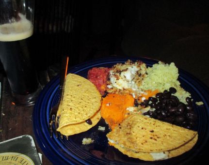 Was in the mood for fish tacos but had some sweet potato leftovers. Breaded tilapia, lime-cilantro rice, black beans and sweet potato was a pretty nifty combo. Also had tomato with green chilies and lime juice. Cooked the tilapia with olive oil and lots of lemon juice. Perhaps the Guinness was a bit strong, but it’s what I had on hand. Mighty tasty dinner.