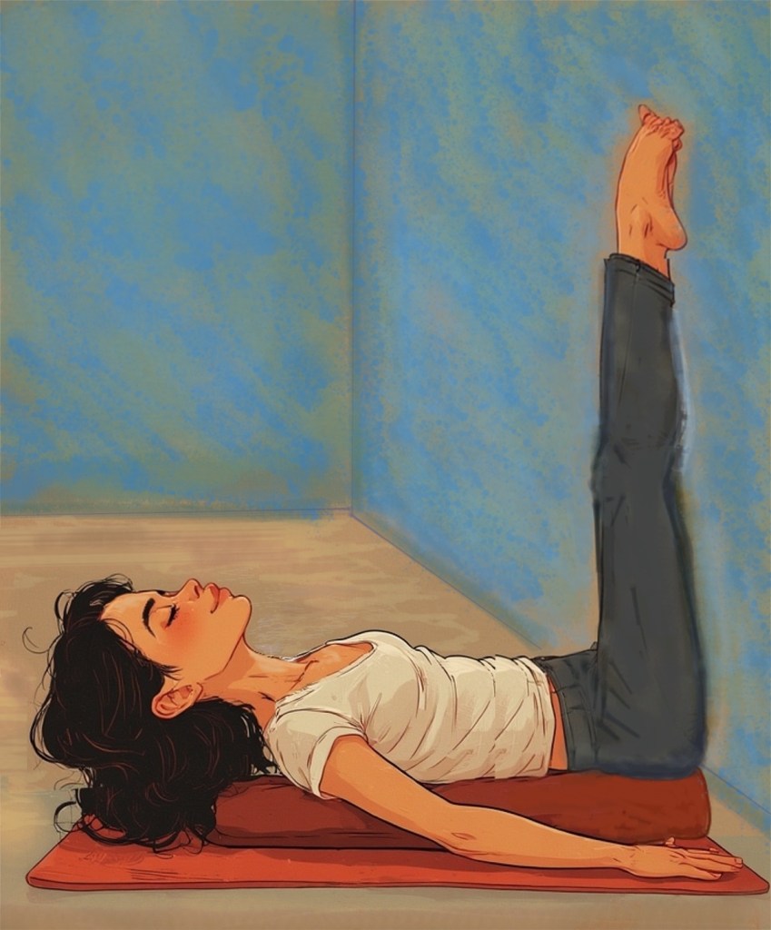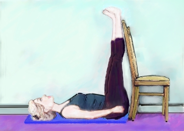This pose is often done as the second to last pose at the end of a yoga session as a cool down, but it could be done anytime for relaxation. And if you can’t get on the floor, you could even do this in bed with your legs against the wall. The goal is to have your back straight and flat with your head supported–you want to be comfortable–and you want your legs as straight as possible and supported. If doing this against a wall, you want to get your hips/buttocks as close to the wall as possible. You may want to begin on your side, get in position, then roll on your back and get your legs up. Once in position, you should feel comfortable. Feel your back connecting to the ground or mat or bed…feel your spine straightening…and a shift of tension from your feet.