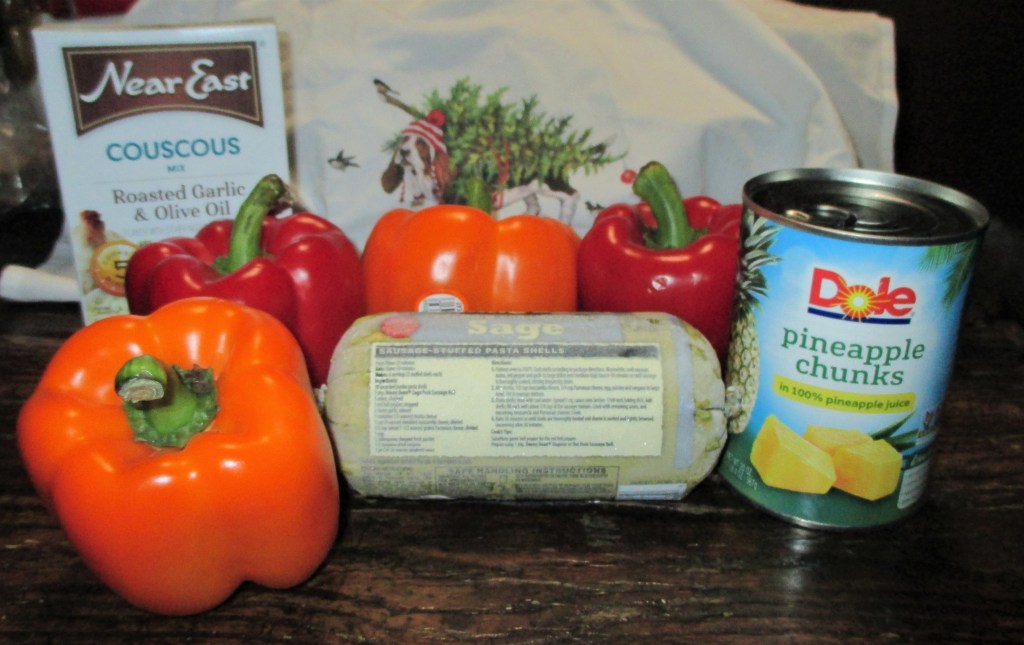 When the peppers are done-ish, pull them out, pull the hats off, and spoon in some couscous. You can stir carefully so the sausage and couscous are blended in the pepper. You might add another pineapple on top to peak out of the hat. This’ll keep it from getting dry and adds color.