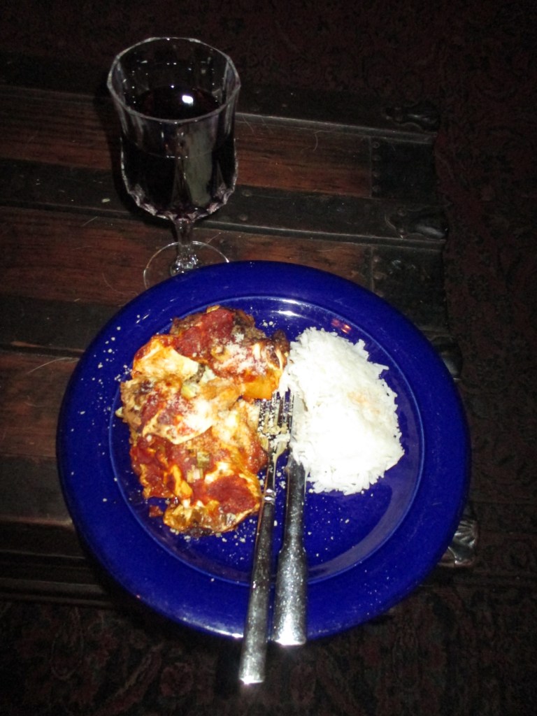 So since the chili sauce with garlic was a success, I’m thinking that a vegetarian version would substitute zucchini for the meat, and green chili sauce instead of red chili sauce. Zucchini and corn? lima beans? I’m looking forward to trying this next. I love green chili sauce. Will post the update when I do.