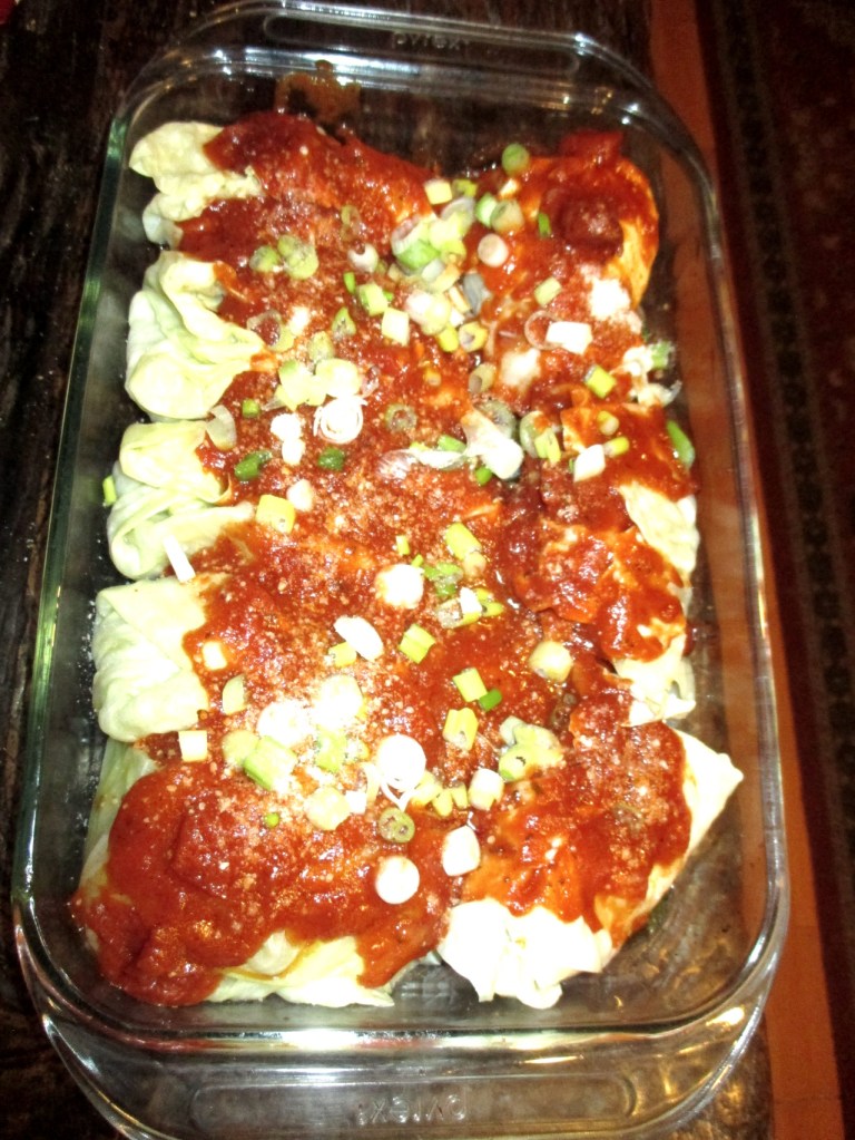 Yes, I cheated on the sauce. I used a jar of sauce to cover the rolls. I chopped up some spring onions and scattered them on the top, then sprinkled with grated cheese.